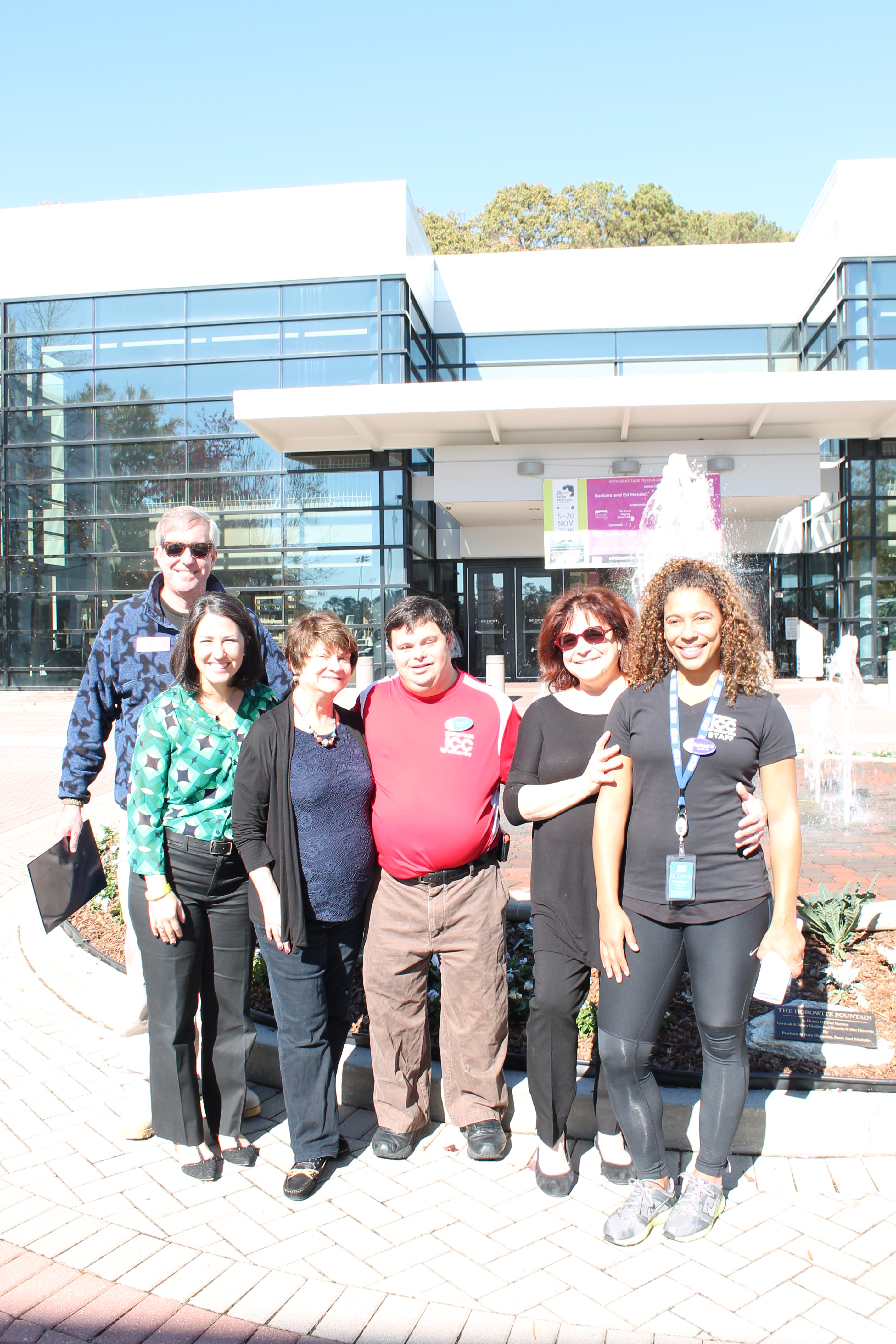 From left to right: Georgia Rep. Tom Taylor; MJCCA’s Amanda Abrams, chief program and innovation officer; Janice Nodvin, mother of Evan Nodvin (center); Meg Shapiro, Evan’s job coach, and Rachael Rinehart, MJCCA director of fitness.